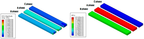 Figure 7 and Figure 8 show the electromagnetic and thermal analysis for a 3-phase parallel array of plate-type and tunnel-type bus-bar. Among the arrayed three bus-bars, the bus-bar located in the center shows the highest temperature rise regardless of the shape of the bus-bar. The maximum temperature of plate-type is 83.1 °C which is higher than that of tunnel-type indicating 75.0 °C and it means that tunnel-type bus-bar has more effective heat dissipation characteristic than plate-type bus-bar in parallel arrayed condition. Therefore, it was confirmed that the use of tunnel-type bus-bar in switchboard could decrease the heat resistance by an advantageous structure for heat dissipation than plate-type bus-bar and it could have a positive effect on energy efficiency.