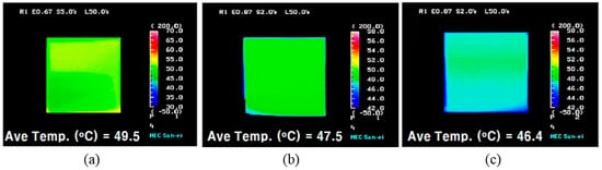 Photographs of the surfaces of the specimens measured by thermal image camera at an atmosphere temperature of 50 °C: (a) Uncoated Cu, (b) CNT-coated Cu, (c) BN-coated Cu.