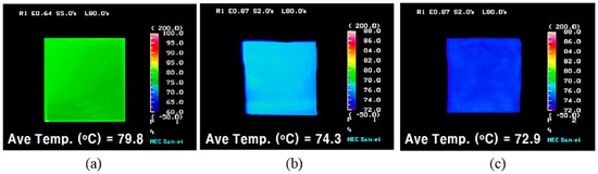 Photographs of the surfaces of the specimens measured by thermal image camera at an atmosphere temperature of 80 °C; (a) Uncoated Cu, (b) CNT-coated Cu, (c) BN-coated Cu.
