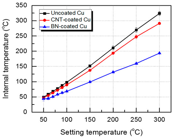 The temperature-drop of the surface by applying coating material was confirmed by a thermal imaging camera. In order to clearly identify the temperature-drop of bus-bar due to the effect of heat dissipation, it is necessary to measure the temperature inside the bus-bar as well as the surface of the bus-bar. Figure 11 shows the internal temperatures of uncoated and coated Cu as a function of setting temperatures. Uncoated Cu specimen measured as a reference shows a similar temperature to the setting temperature of a hot plate from 50 °C to 200 °C. The internal substrate temperatures of coated specimens show a lower temperature than the setting temperature. In addition, temperature-drop rates of coated specimens increased more steeply with the increasing setting temperature. At the setting temperature of 80 °C, the internal temperatures of uncoated, CNT-coated, and BN-coated specimens are 77.5, 72.1, and 58.1 °C respectively. From the results of Figure 10 and Figure 11, it could be inferred that the surface temperature might be higher than the internal substrate temperature in all specimens, although the difference of heating system between the atmosphere temperature control using heating chamber and the direct temperature rise at the specimens using a hot plate was present. The temperature difference of the surface and substrate of BN-coated specimen is approximately 14.8 °C, and it means that the BN coating material indicated excellent heat dissipation characteristics.