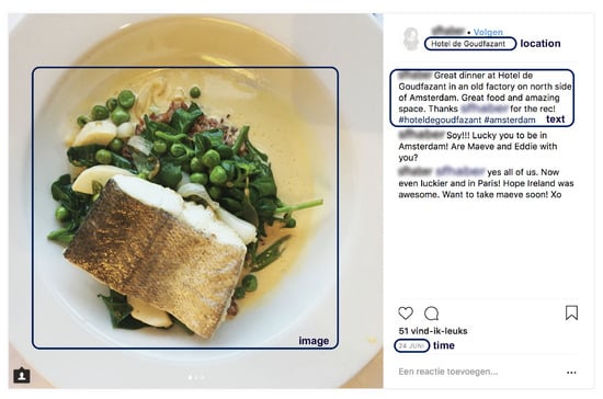 Figure 1 illustrates the intuition behind this work, the message (Great dinner at Hotel de Goudfazart […]) suggests that the picture is taken by the user during dinner. In addition, in the image we can indeed identify some kind of cooked fish and vegetables. Furthermore, the hash tags and the location where the user has checked in indicate that the dinner took place in the Hotel de Goudfazant. By looking at the place properties, we discover that the restaurant is located in Amsterdam, the Netherlands. Moreover, we can suppose that the person travelled to the restaurant using either a car or by public transportation. To conclude, this post discloses information about food (i.e., the dinner was cooked), leisure (i.e., the activity takes place in) and mobility (i.e., the individual had to travel to get at the venue) energy-consuming activities.