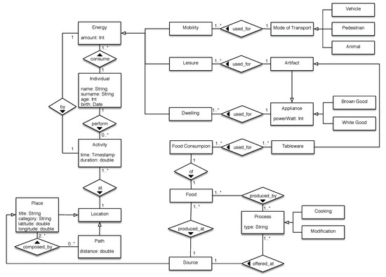 As depicted in Figure 2, an Individual consumes energy by performing an Activity at a certain Location, at a certain time, and for a certain period of time. That activity can be of multiple types: Dwelling, Mobility, Food Consumption, and/or Leisure.