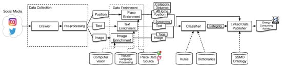 Using the enriched data, the social media post is classified to one or more of the energy-consuming activity categories using a hybrid rule and dictionary-based approach.