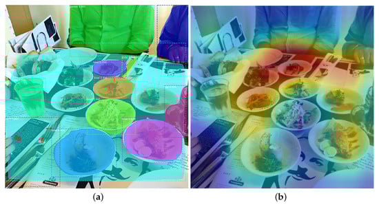 Differences in computer vision techniques applied to the same images; (a) uses an object recognition method that person, dining table, cup (2x), knife (2x), bowl (5x), while (b) uses a scene recognition one extracting dining hall, cafeteria, and delicatessen annotations.