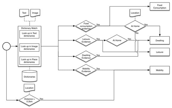 Then, the post is classified according to the rules illustrated in Figure 6. For each term, we identify if it is evidence (i.e., it appears in one of the dictionaries) for one or more energy-consuming activities. In case a leisure or food consumption activity is performed at home, we can classify it to dwelling as well. Furthermore, if a food consumption activity is performed at some place other than home, we classify it as a leisure activity.