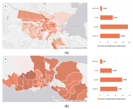 In both cities, few social media posts referring to dwelling activities were captured by the framework. This may be because social media users do not consider their regular domestic activities interesting enough to be shared with other social media users.
