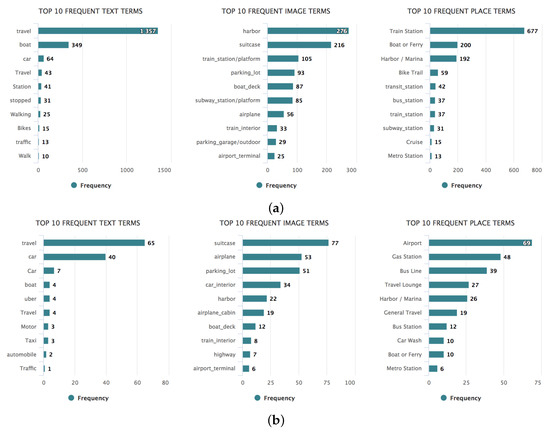 Bar charts visualizing the most occurring term in social media posts classified to mobility activities in Amsterdam (a) and Istanbul (b). For readability purposes, in the figures we show only English terms.