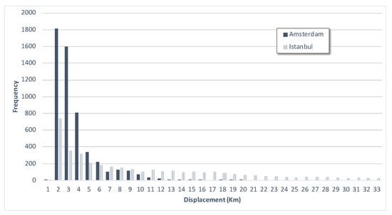 If we compare the frequencies of displacements of both cities (Figure 14) we can observe that while in Amsterdam people tend to travel for short distances (between 1 and 5 km), in Istanbul the chart shows a long tail distribution. Since Istanbul is significantly larger in size than Amsterdam, this is in line with our expectations.