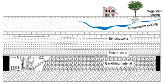 With the advancing working face, the roof begins to sink and the backfilling materials are compacted progressively. The backfilling material plays a very important role that supports the roof in the gob, which requires the backfilling material to undergo small deformation during compaction and absorb more energy from the roof [18]. The ideal result with the backfill that needs to be achieved is to form a fissure and bending zones in the overburden rock layers to the limit where the formation of a caving zone is initiated [19], as shown in Figure 1. Therefore, different materials have a different effect on the cracks and deformation of the overburden rock layer in the gob.