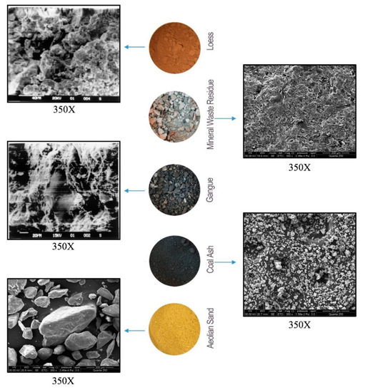 As shown in Figure 2, Aeolian sand particles are very small, uniform, dense, and hard, which means efficient pressure transfer among particles. Coal ash is fluffy internally and the particles have an irregularly flaky structure. The gangue particles are dense, small particles filled with few large particles. The mineral waste residue has a large portation of bulky mineral. The loess has developed intergranular mesopores and micropores, with good connectivity between them, and loose structure.