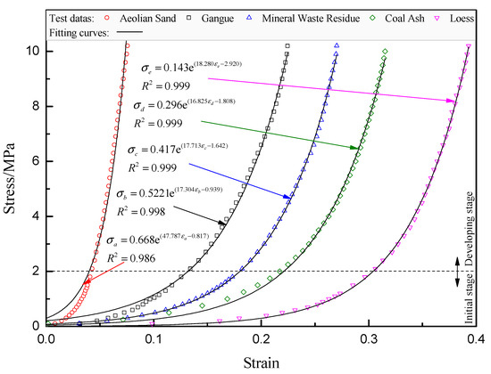 As shown in Figure 3, the stress-strain curves of five backfilling materials show an exponential distribution trend. In the initial stage (0–2 MPa), the strain increase is larger and the deformation rate is faster, which accounts for 70–80% of the total strain. With the gradual increase of pressure, the filling material is gradually compacted and the strain increment decreases gradually. The compaction stress state of the five materials from high to low is Aeolian sand, gangue, mineral waste residue, coal ash, and loess.