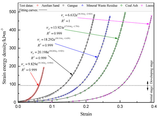 As shown in Figure 4, the strain energy density-strain curve of the five materials are also exponentially distributed. In the initial stage (0–2 MPa), the strain energy density accounts for only 10% to 30% of the entire strain energy density. At a constant strain energy density, each material’s deformation is different. For example, at a strain energy density value of 100 kJ/m3, the Aeolian sand strain is 0.063, meanwhile, the loess’s strain is 0.221. Therefore, to absorb the same amount of energy, the leoss deformation is larger.