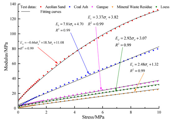 where σi (MPa) and εi are the arbitrary point stress and strain, respectively, and σ0 (MPa) and ε0 are the zero point stress and strain, respectively. The relationship of the five backfilling materials’ modulus and stress is shown in Figure 5.