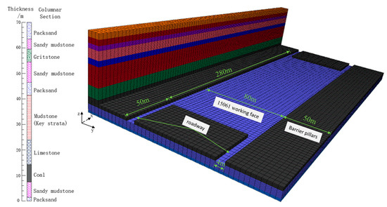 FLAC3D numerical simulation software was used to investigate the filling effect of five different backfilling materials. A numerical model was built based on the size of panel 15,061, with a total width in y-direction of 188 m, the length of one zone is 2.5 m total length in x-direction of 380 m, the length of one zone is 4 m, height in z-direction of 70 m, the length of one zone is 4 m, and a barrier pillar width of 50 m, as shown in Figure 7. The geostress in mine site is main affected by the vertical stress by monitoring the crustal stress. Thus, the uniform vertical stress, 2.5 MPa, was applied at the top of the model. The Mohr–Coulomb model was adopted for the rock strata and strain soften model used in the coal seam. After mining the coal seam, filling with the backfilling materials which compaction property, such as dynamic deformation modulus, operated by writing the fish language into the backfilling model.