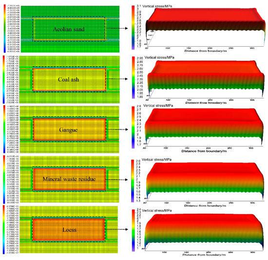 The backfilling material’s modulus and stress follow the path shown in Figure 5. The backfilling material’s vertical stresses were obtained as shown in Figure 8.
