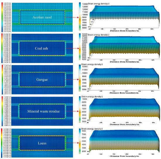 Using the FISH language and Equation (5) to configure a new variate: strain energy density, the five backfilling materials’ strain energy density are shown in Figure 9.