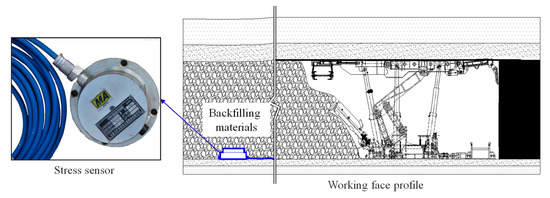 In order to compare the different backfilling materials stress change and filling effect, two mine sites were selected. One of the mine sites is Dongpin coal mine and the other is the Taiyuan coal mine, which is located at Yulin, Shanxi province. The Aeolian sand is used as backfilling material in Taiyuan coal mine and gangue in the Dongpin coal mine. A series of rock stress sensors are installed in the backfilling materials to monitor the stress in the two mine sites, the schematic of which is shown in Figure 10.