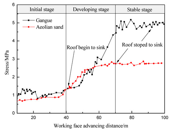 The pressure from the overlying roof will be applied to the front of the working face and backfill materials in SBM [25]. As shown in Figure 8, in SBM, the backfilling material’s stress is higher while the abutment pressure is reduced. This indicates that the backfilling materials can share part of the pressure with the boundary coal pillar. The higher compaction stress of the backfilling materials also signifies the better resistance, such as Aeolian sand and coal ash. Meanwhile, the abutment pressure in front of working face is lower with Aeolian sand and coal ash than other backfilling materials, which is important to ensure the safety of the working face, because the Aeolian sand and coal ash backfilling material bear more pressure from the overlying strata when compared to other materials.