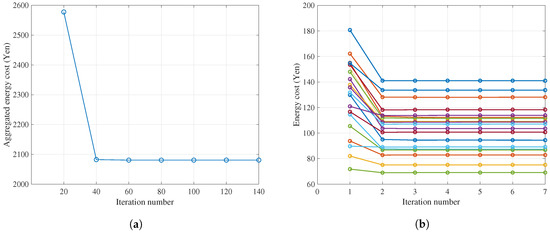 First, the convergence of the proposed DSM consumption scheduling algorithm is investigated. Figure 2a,b show aggregated community and 20 individual users energy cost as the iteration number increases. The results show that the algorithm converges in less than 60 iterations in total, that is, each user approximately computes its consumption schedule for 3 times.