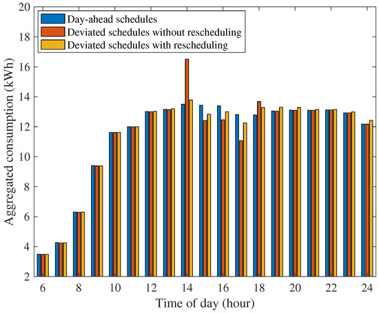 Aggregated consumption profile of 20 users in the case of day-ahead schedules, deviated schedules without and with rescheduling.