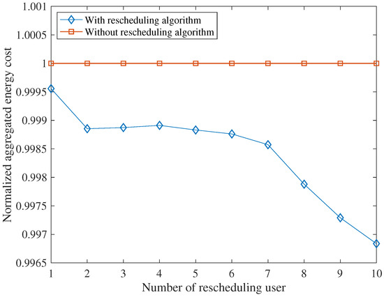 We further show the impact of the proposed rescheduling algorithm by varying a different number of rescheduling users. The normalized aggregated energy cost is shown in Figure 6 for the case of with and without rescheduling algorithm as the number of rescheduling user increases. The result shows that when the number of rescheduling users increased, the greater cost reduction of the proposed rescheduling algorithm can be achieved when compared to the without-rescheduling scenario. This is because the rescheduling algorithm has even more chances to optimize various consumption loads, avoiding further consumption peaks. These results demonstrate the effectiveness of the proposed rescheduling algorithm when it comes to avoiding consumption peaks and thus flattening the total consumption profiles, resulting in lower total energy costs.
