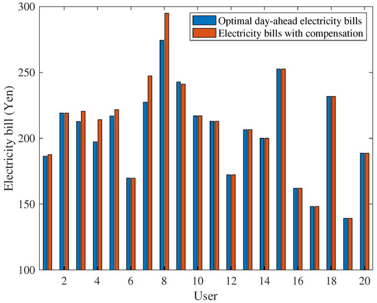 The bill compensation adjusts electricity cost for all users such that the rescheduling user m takes responsibility of the cost induced by his action. In Equation (25), the bill compensation of each user n is and for the rescheduling user m is the sum of bill differences from all other users. This bill compensation is calculated for all rescheduling user and will be added to the user’s final electricity bill.