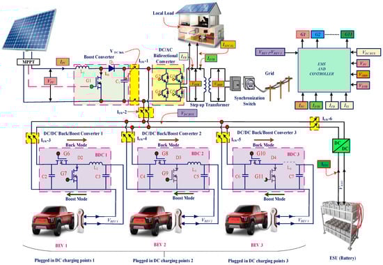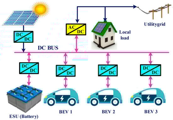 Integration of BEVs and renewable energy sources (RESs) with hybrid microgrids is much needed to provide high DC power directly without any reactive power compensation [,]. To meet the local load demand and BEV requirements, the modern charging station needs to be upgraded [,]. A BEV charging station powered by photovoltaic (PV) energy produces uncertainties between PV and BEV which can be analyzed by radial distribution systems []. The losses from AC-DC conversion can be minimized by selecting the proper operating voltage level at the charging station []. Similarly, the number of required charging stations can be significantly reduced by developing multiport charging with real-time forecasting of charging station infrastructure [,]. The PV and energy storage unit (ESU)-connected DC microgrid system is used to charge BEVs available at the charging station, and the DC bus connection with the RES has to follow requirements for network coordination, earthing, and DC network protection []. A rudimentary multiport BEV charging architecture with a hybrid microgrid is illustrated in Figure 1. It consists of a PV power generating unit, ESU, utility grid, BEV charging points, local load (home appliance), AC-DC-AC bidirectional converter, and bidirectional buck/boost converters.