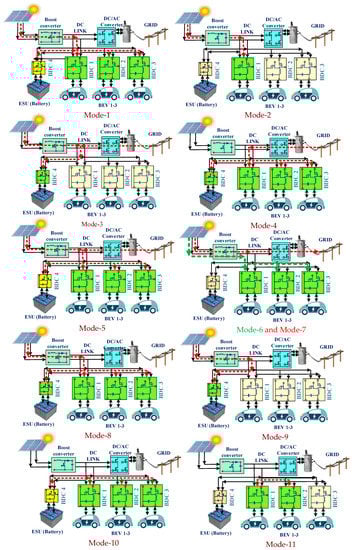 Based on the state of charge (SOC) of the three BEVs, the EMS determines the mode of operation, such as grid to vehicle (G2V), ESU to vehicle (ESU2V), and V2V. The BEV operates in V2V mode when there is a demand for electricity in the hybrid microgrid. The operating modes are selected based on the reference DC power produced by PV and distribution transformer current. The 11 operating modes of the charging station and the direction of power flow are depicted in Figure 3.