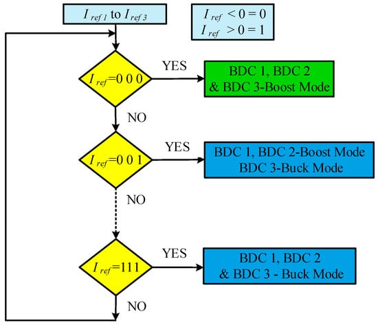 Based on the charging current (Iref), the bidirectional converter operates in buck or boost mode. If Iref is less than or equal to zero, the BEV is fully charged and does not take current from the DC bus; the particular charging bidirectional converter operates in boost mode (V2V). If Iref of the BEV is greater than zero, the BEV needs to be charged; hence, the particular charging bidirectional converter operates in buck (microgrid to vehicle) mode. With BDC 1, BDC 2, and BDC 3 indicating the bidirectional converters, the various combinations of Iref and the operating modes of the bidirectional converters are shown in Figure 4.