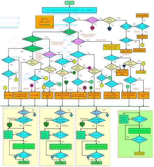 The EMS of the charging station was developed based on various parameters of the charging station to provide a continuous supply to the charging point. The EMS flowchart of the charging station is shown in Figure 5. The following variables are taken into consideration for deciding on the different operating modes: IDTR, PPV, PPV REF-1, PPV REF-2, PPV REF-3, SOCESU, and SOCBEVs. The various modes and direction of power flow are as follows:
