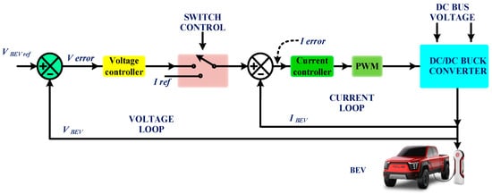 The BEV battery is charged by providing constant-voltage and constant-current control to the charging converter. Fast charging is done by inner current loop control; the outer voltage loop control used for constant-voltage charging is shown in Figure 6. When the current flowing into the battery is positive, Ibatt > 0, the battery is charged; otherwise, it is discharged. Based on the sign of the battery current (Iref), the EMS controller is providing regulated supply to the battery.