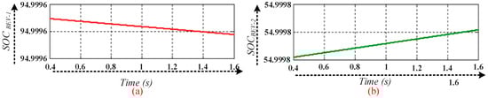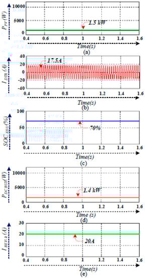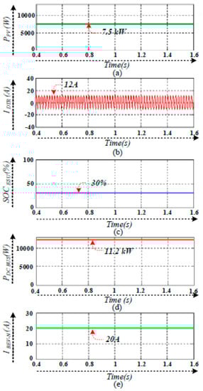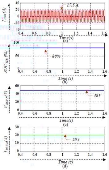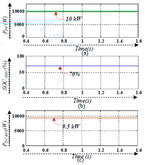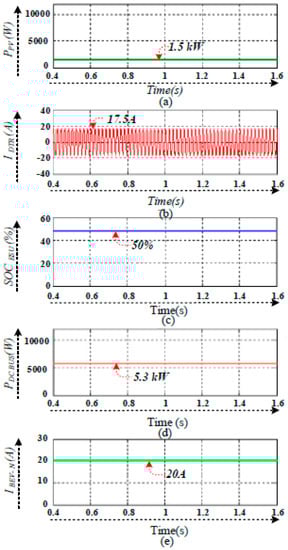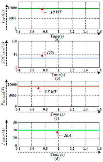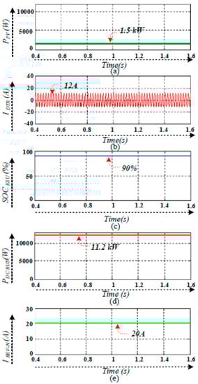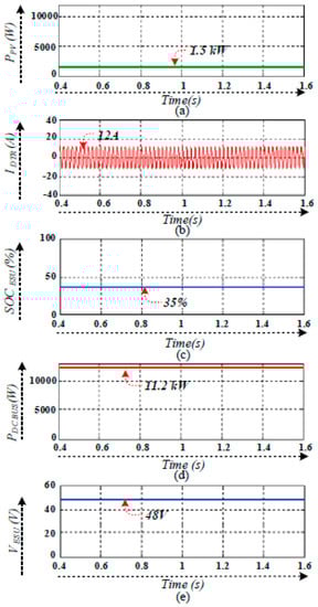 When the PPV is less than 1.5 kW, the utility grid is off-peak (IDTR = 12 A), the SOC of the ESU is less than 40%, and the power required to charge the ESU and BEVs is drawn from the PV system and the utility grid; the grid-connected AC-DC converter works in rectification mode. Therefore, the ESU and BEVs are charged from the utility grid and PV, and power at the DC bus is maintained at a rated capacity of 11.2 kW; in this scenario, 1.5 kW of power is drawn from the PV and the remaining power is taken from the utility grid, as shown in Figure 9. At the same PV power level, SOCESU is greater than 40%, and the PV system and the utility grid provide the continuous supply to the charging station. DC bus power is maintained at 11.2 kW, as shown in Figure 10.