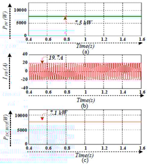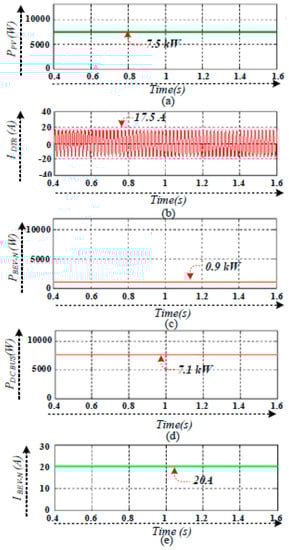 The power generated by the PV system is 7.5 kW, the utility grid is not overloaded, and the SOC of the ESU is less than 40%. The power required to charge the BEV and ESU is 9 kW; all the power generated by the PV is transferred to the DC bus and the utility grid supplies the deficit. Power in the DC bus is maintained at 11.2 kW, as shown in Figure 11. For the above PV power level, the utility grid is at peak conditions; all the BEVs are charged from the PV system, and the DC bus power is maintained at 7.1 kW, as shown in Figure 12.