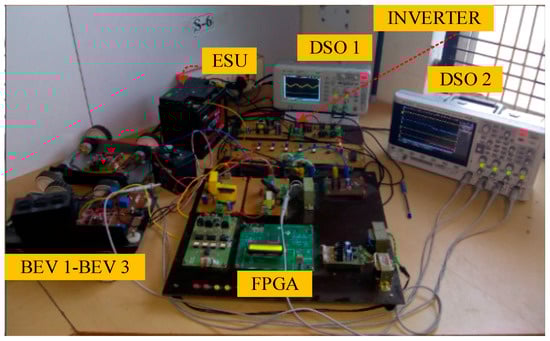 Different modes of the charging station were evaluated using MATLAB Simulink. The simulation module consists of the BEV battery and power converters: DC-AC, AC-DC, and DC-DC converters. A PV system of 12 kW and the utility grid are used to power the charging station. A backup ESU battery of 6 kWh (48 V) is connected to the charging station to provide uninterrupted supply. The BEVs are considered to be storage batteries (BEV 1–3) with a power rating of 1 kW.