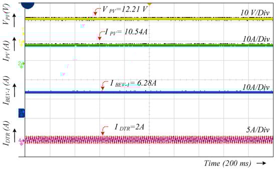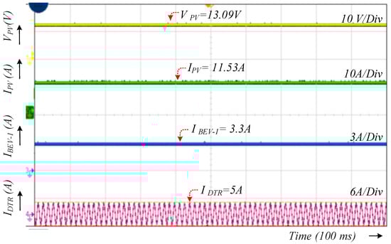 When the PV power is less than 1.5 kW, the peak demand from the utility grid (IDTR MAX = 17.5 A) and the ESU have an SOC of greater than 40%; power produced by the PV is not sufficient to charge all the BEVs available at the charging terminals. During this condition, the power required to charge the BEVs is drawn from PV and the ESU, as shown in Figure 7. In Mode-1, total power in the DC bus is maintained as 5.3 kW, which is sufficient to charge all BEVs. With the same PV power level, the charging station has one BEV for charging, and the power produced by the PV system is greater than that needed by the vehicle available at the charging point; the particular BEV is charged from the PV by Mode-2 and is shown in Figure 8.