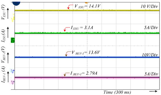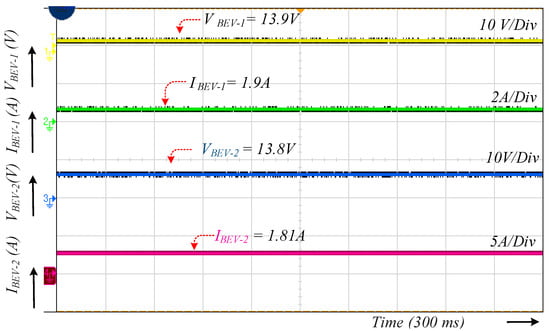 In this mode, the charging power is transferred from the ESU to BEVs. The PV system and utility grid are not able to provide charging power; the ESU provides a charging supply of 14.1 V and 3.1 A to the BEVs. A BEV is charged with 13.6 V and 2.79 A, as shown in Figure 23.