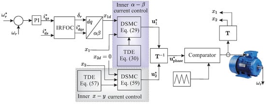A two-degree PI controller with a saturation stage, introduced in [37], is used as the outer speed control loop, based on the IRFOC method. In this loop, the output of the PI regulator is used to get the dynamic current reference . In addition, the slip frequency calculation is obtained from the current references in the dynamic reference frame and the electrical parameters of the six-phase IM, as shown in Figure 2.