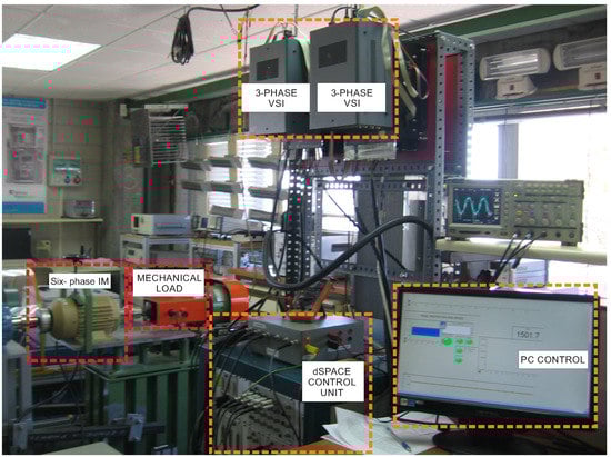 The proposed DSMC technique was tested in order to validate its performance with experimental results obtained in the test bench, and this consisted of a six-phase IM powered by two conventional three-phase VSI, being equivalent to a six-leg VSI, using a constant DC-bus voltage from a DC power supply system. The six-leg VSI was controlled by a dSPACE MABXII DS1401 real-time rapid prototyping platform, with Simulink version 8.2. The results obtained were captured and processed using MATLAB R2013b script. The parameters of the asymmetrical six-phase IM were obtained using conventional methods of the AC time domain and stand-still with VSI supply tests [40,41]. The results are listed in Table 1. The experimental tests were performed with current sensors LA 55-P s, which had a frequency bandwidth from DC up to 200 kHz. The current measurements were then converted to digital form using a 16-bit A/D converter. The six-phase IM position was obtained with a 1024-ppr incremental encoder, and the rotor speed was estimated from it. Finally, a 5 HP eddy current brake was used to introduce a variable mechanical load on the IM. A block diagram of the experimental bench is shown in Figure 3, including some photos of the equipment.