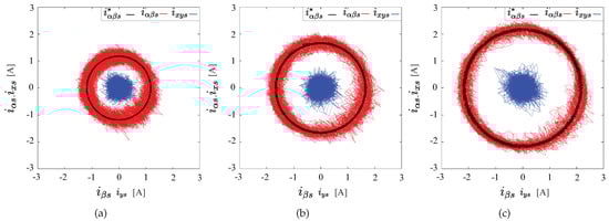 Stator currents in the and planes for a rotor speed of: (a) 500 rpm; (b) rpm; (c) rpm.