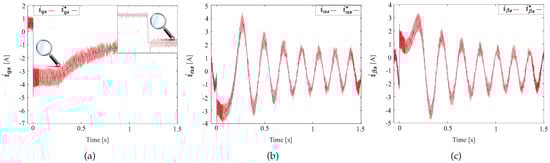 Transient response of stator currents from a step response of 500 rpm to rpm from at a frequency sample of 8 kHz: (a) ; (b) ; (c) .