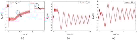 Transient response of stator currents from a step response of 500 rpm to rpm from at a frequency sample of 16 kHz: (a) ; (b) ; (c) .