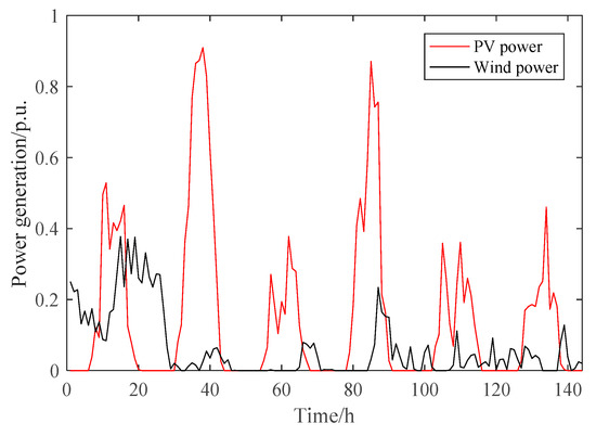 The modified IEEE RTS-24 bus system was utilized to verify the effectiveness of the proposed model. The parameters of the system are described in detail in [26]. In this paper, a wind farm and a PV farm were connected to bus 7 and bus 18 to replace two generators connected to the two buses, respectively. Real measurements of the outputs of a wind farm and a PV farm in the same area of Zhejiang Province were utilized to formulate the aggregated distribution model of wind power and PV power.
