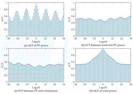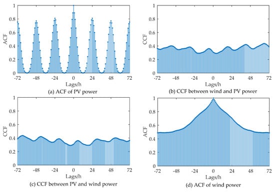 where a is the lag time between the two series; is the power generation of the PV or wind farm at time t; and and are the mean value and variance of the time series, respectively.