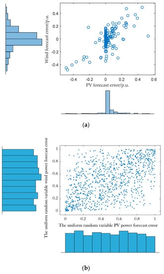 A Gaussian copula function has been utilized in this paper. As copula functions construct the joint CDF only for uniform random variables, it is necessary to transform the marginal CDFs of wind and PV power into uniform distributions. It is indicated in [23] that for uniform random variables with a symmetrical dependence structure, a Gaussian copula function can estimate their joint CDF with high accuracy. For this reason, a scatter plot was utilized to explore the dependence structure of wind and PV power after uniform transformation. Figure 4 presents the scatter plot results of the pairs of PV and wind power forecast errors, which were obtained by calculating the difference between the sampled data and the results of the SBL prediction model mentioned in Section 2.1. In Figure 4a, the wind power and PV power forecast error series are plotted. In Figure 4b, the scatter plot of the transformed uniform random variables of wind power and PV power forecast error series are displayed. The transformation was implemented by probability integral transform rules [24]. With regards to the scatter plot results, the clearly symmetrical dependence structure demonstrates that the dependence relation between PV and wind power forecast error series can be modeled by a Gaussian copula function.