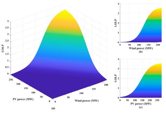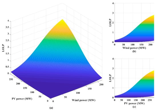 Loss of load probability (LOLP) variation with respect to installed capacities of wind power and PV power, considering correlations. (a) LOLP with respect to wind power and PV power; (b) LOLP with respect to wind power; (c) LOLP with respect to PV power.