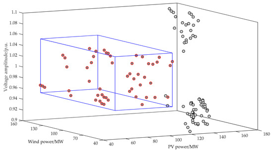 The variation of the system voltage amplitude corresponding to the installed capacities of wind power and PV power is shown in Figure 7. The voltage amplitude with respect to a specific pair of wind and PV power is the voltage of the specific bus whose voltage deviated most from the reference value of 1 in p.u. in all normal scenarios without component failure. In China, the normalized bus voltage amplitude is required to be within 0.95–1.05 in a normal operation state of a power system. As shown in Figure 7, the blue box in three-dimensional space is the acceptable voltage amplitude corresponding to the optimal installed capacities of wind power and PV power. The red circles with a deep gray color are the optimal simulation results. With the proposed model, we can identify the optimal installed capacities of wind power and PV power considering the possible bus voltage variations of the power system.