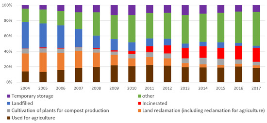 Changing trends for sewage sludge utilization in Poland according to the Main Statistical Office of Poland (GUS) [7] (“Used for agriculture” means the cultivation of all marketed crops, including crops designed to produce fodder; “Landfilled” is used exclusively for deposition in locations which have an official status as landfill areas).