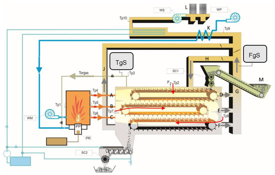 Multistage tape dryer/torrefier developed by Wroclaw University of Science and Technology (Tp—thermocouple; TgS—torgas sampling port; FgS—flue gas sampling port; WP—preheated secondary air blower; WM—primary air blower; WS—flue gas extraction fan; SC1—airlock at the inlet; SC2—airlock at the outlet; PR—pressure regulator; PP—oil burner; P—pressure gauge; A,B,C—ducts delivering hot flue gases to the inside of the shelves; D,E,F—ducts for evacuation of the flue gases out of the shelves; G—main flue gas extraction duct; H—flue gas recirculation to the freeboard of the reactor; J—duct for extraction of the gases out of the freeboard of the reactor; K—combustion air pre-heater; L—bag filters).