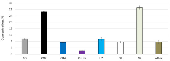 Torrefaction was performed in an oxidizing atmosphere, as can be clearly determined from the composition of torgas presented in Figure 5. Among the permanent gaseous products of torrefaction, CO2 was prevalent. Nonetheless, CO content was substantial. Moreover, the content of hydrogen, methane and other light hydrocarbons (CnHm) was significant when torrefaction processes were considered. The average LHV of the permanent gases produced from the torgas was relatively high (15.10 MJ/m3). The calculated mass yield was 0.754, whereas the calculated energy yield was 0.494.