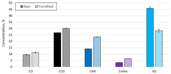 There were significant differences in the average composition of the gas obtained during both experiments (see Figure 6). The most notable was the difference in the hydrogen content, which was much higher in the case of the gasification of raw sewage sludge in comparison to the gasification of torrefied sewage sludge. On the other hand, the concentration of methane, as well as the concentration of other light hydrocarbons (CnHm), was substantially higher during the gasification of the torrefied sewage sludge. The contents of carbon dioxide and carbon monoxide were also higher for the experiment performed with torrefied feedstock. As a consequence of their respective compositions, dry producer gases from the gasification of raw sewage sludge had an average lower heating value of 13.51 MJ/m3, whereas the gas produced from torrefied sewage sludge reached 17.51 MJ/m3 on average.
